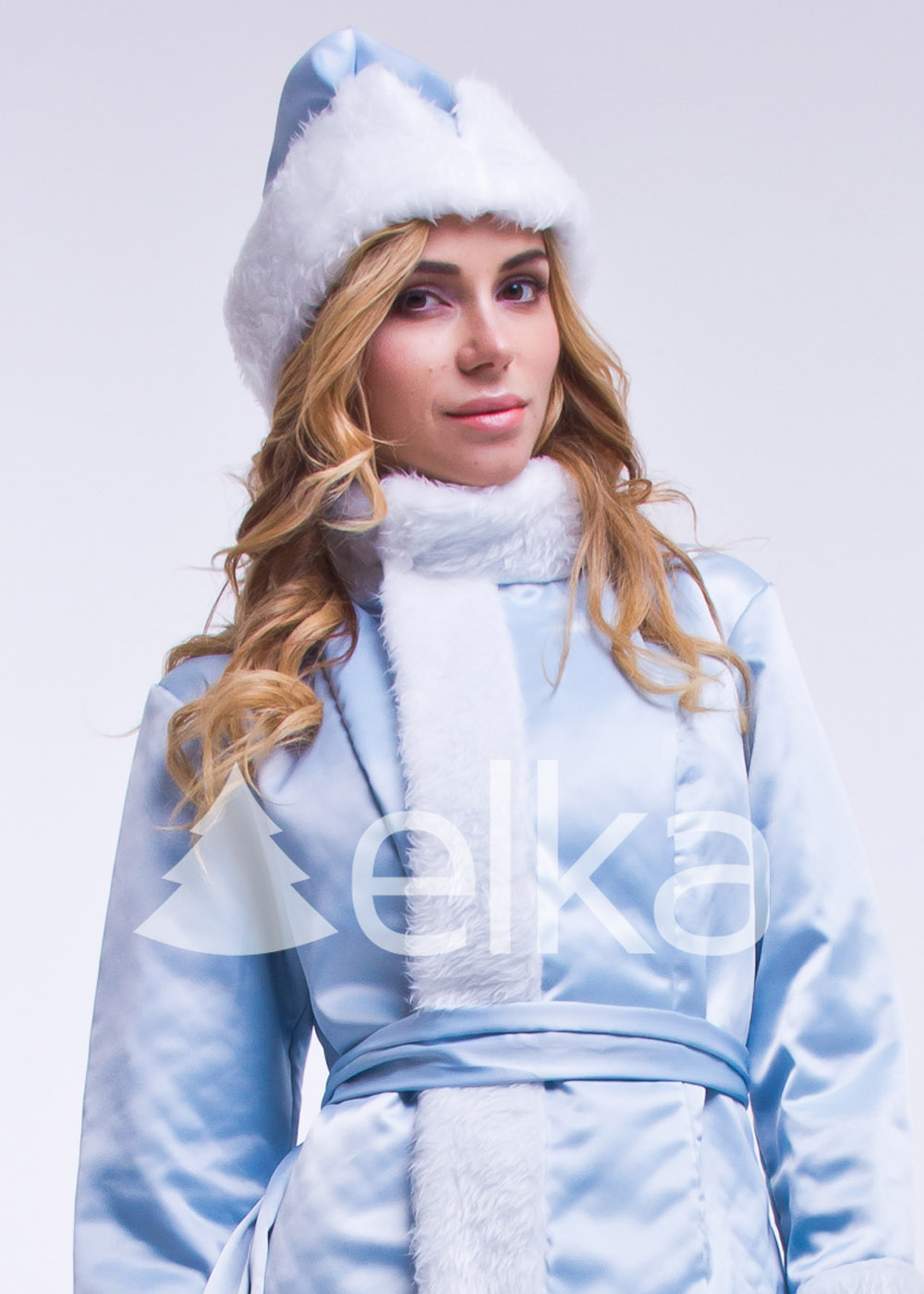 Материал – атлас нежно голубого цвета переливается под яркими прожекторами и светом гирлянд. Края костюма, кисточки пояса и шапочка обшиты блестящим белым мехом. Изнаночная ткань состоит из стеганой подкладки, которая прекрасно удерживает тепло и сохраняет форму наряда. Модель до колен понравится активным, молодым девушкам, которые много времени проводят в движении, любят викторины и конкурсы.