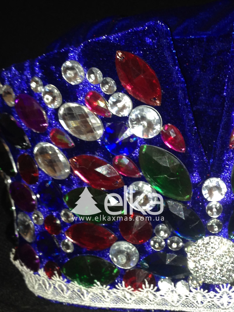 Настоящему доброму сказочнику Деду Морозу никак не обойтись без Королевской шапки. Нарядная шапка из синего бархата обшита сверкающими камнями.