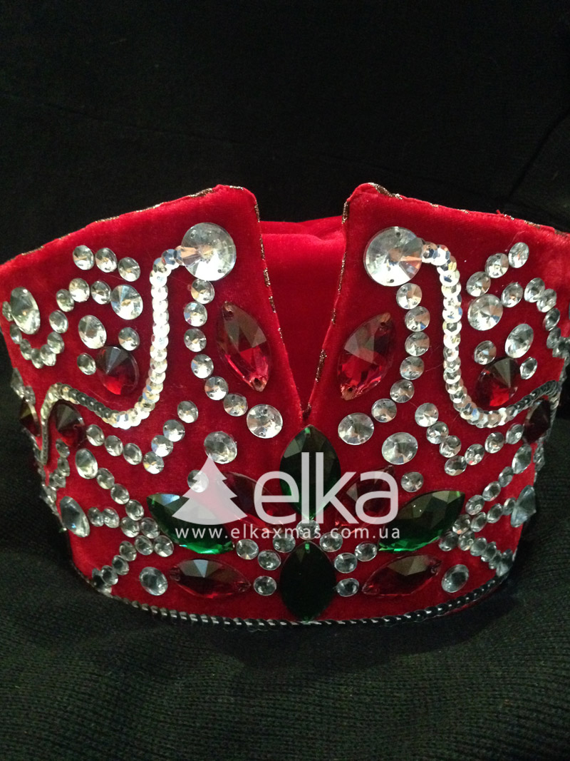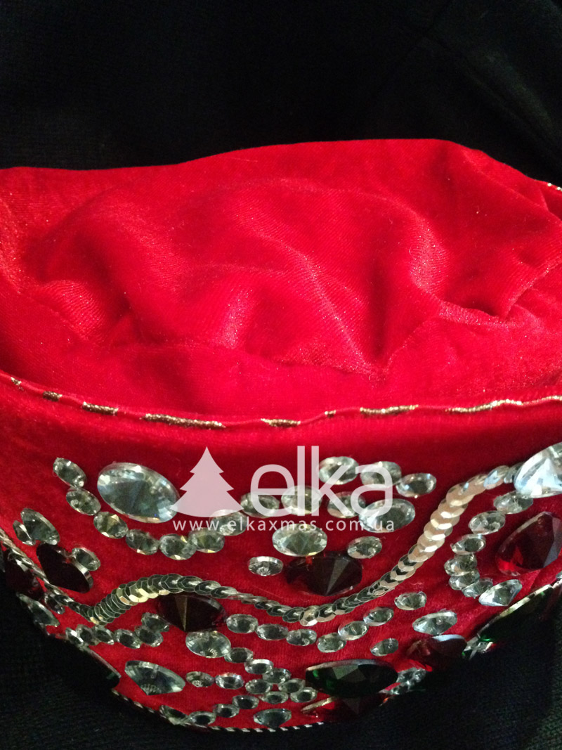 Настоящему доброму сказочнику Деду Морозу никак не обойтись без Царской шапки. Нарядная шапка из синего бархата обшита сверкающими камнями.