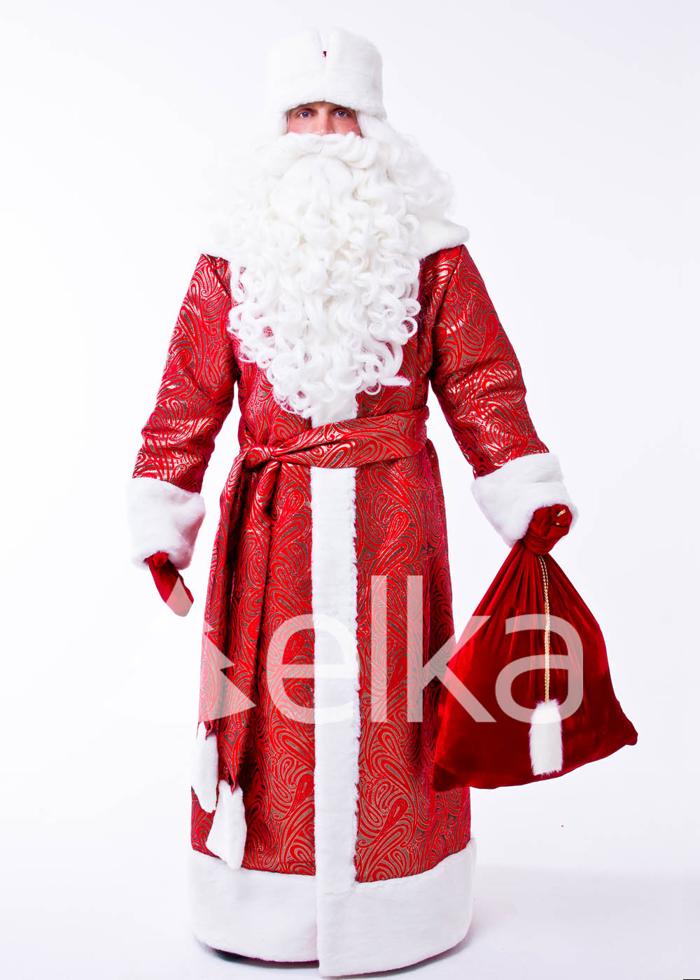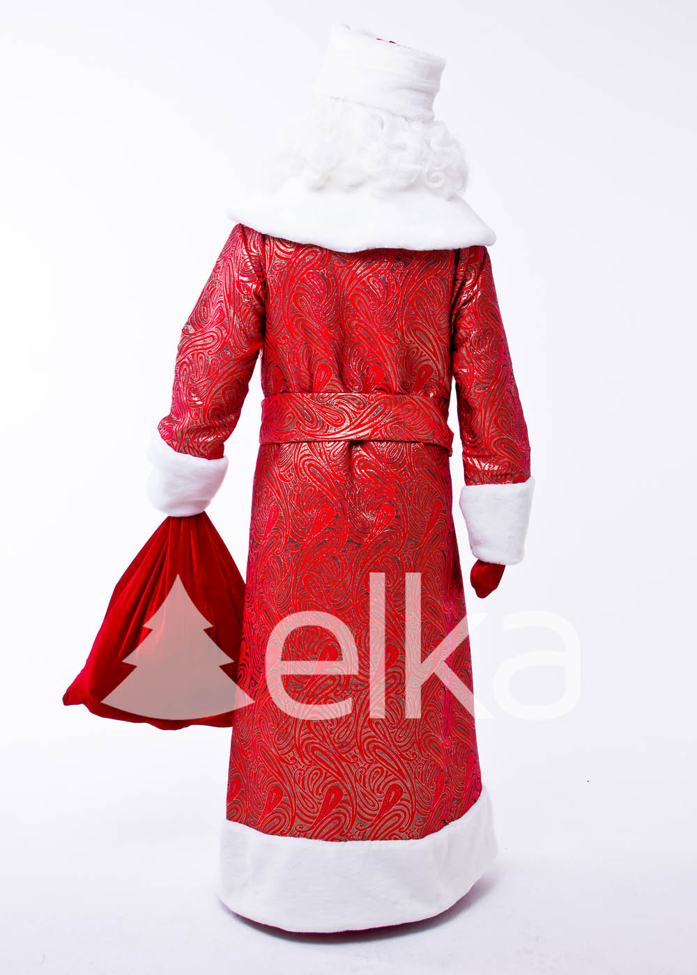 На праздничном карнавале невозможно остаться незамеченным, если на Вас костюм деда Мороза «Чудотворец». Ярко – красный жаккард на шубе, поясе и шапке расписан золотистыми узорами. Искусственный мех мутон выгодно выделяет силуэт. Шуба на стеганой подкладке не потеряет форму, подходит для выступлений на улице при минусовой температуре воздуха.