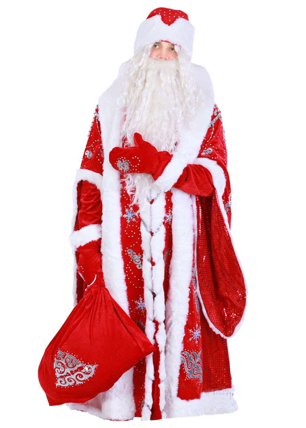 На праздничном карнавале невозможно остаться незамеченным, если на Вас костюм деда Мороза «Копейкин». Ярко – красный велюр на шубе, поясе и шапке расписан серебрянными узорами. Искусственный мех мутон выгодно выделяет силуэт. Шуба на стеганой подкладке не потеряет форму, подходит для выступлений на улице при минусовой температуре воздуха.