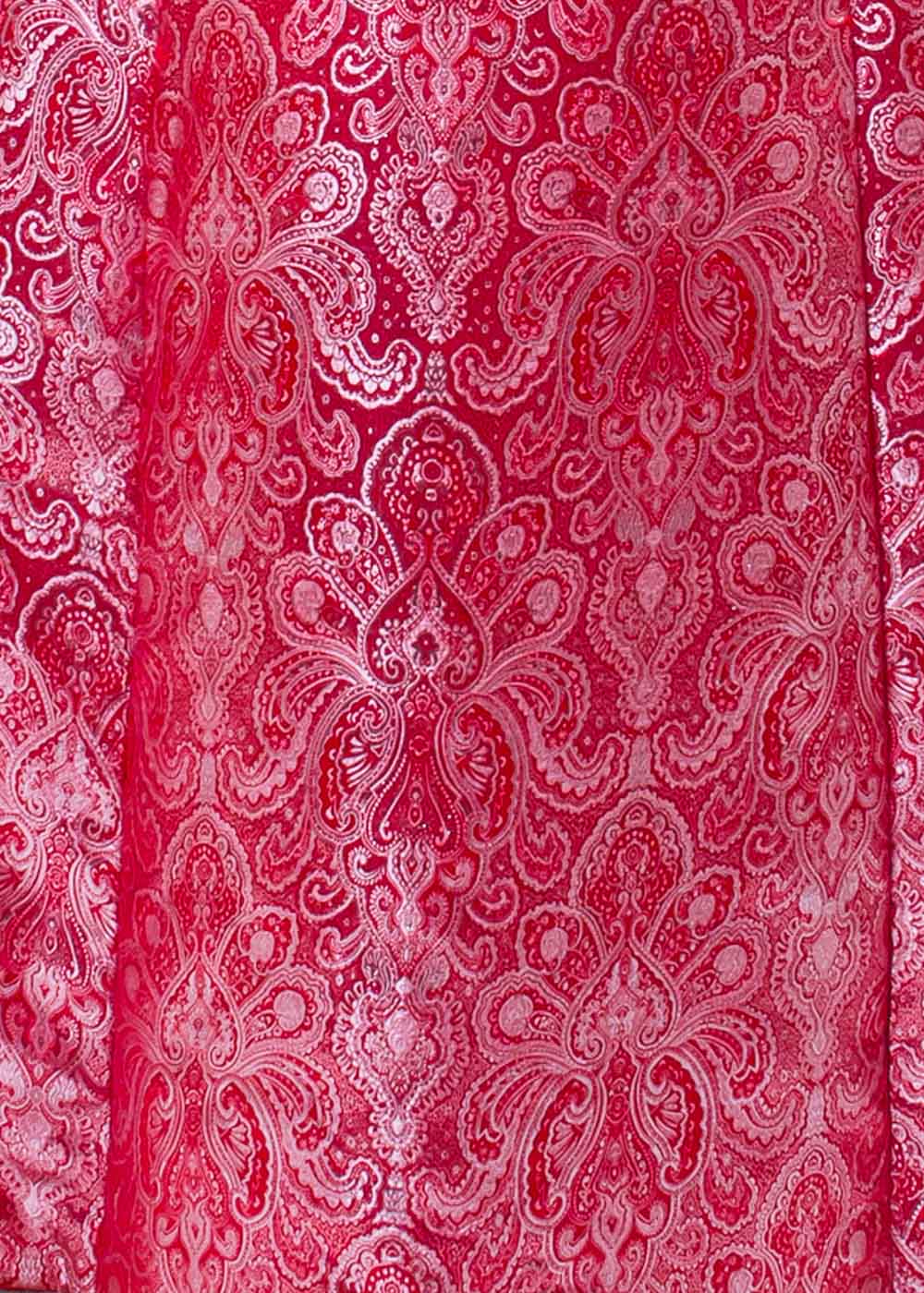 Костюм деда Мороза «Устюжский» из алой парчи с декором из серебристых снежных узоров. Легкая подкладка отлично поддерживает клешенную форму шубы, дает возможность участвовать в уличных представлениях. Материал пропускает воздух, приятный к телу, внутренние швы не натирают кожу.