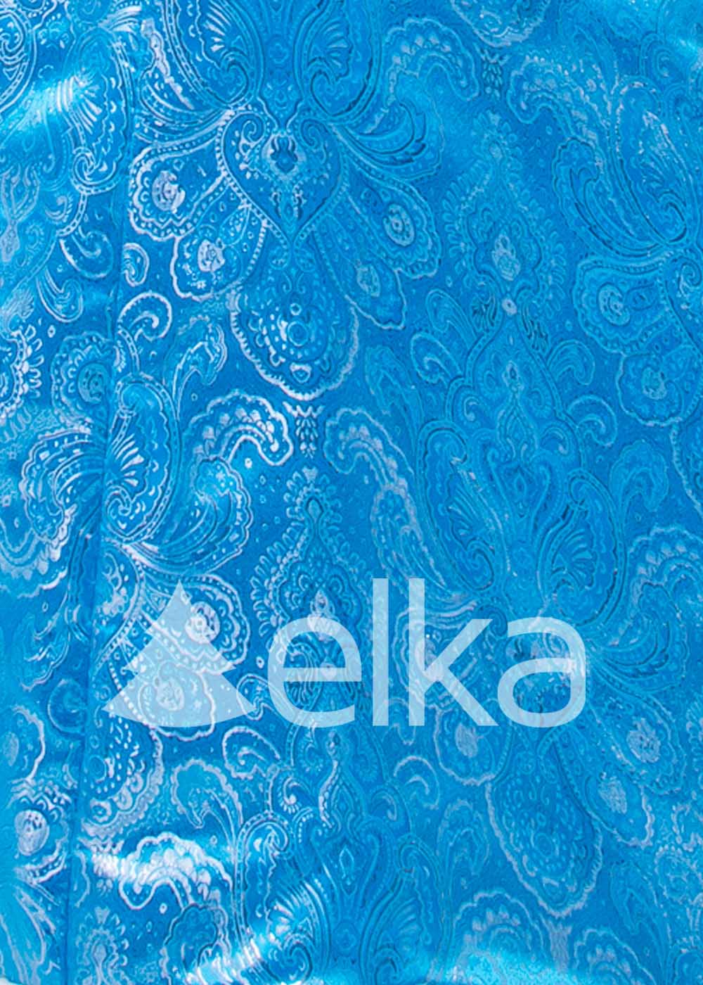 • Яркая парча расшита замысловатыми узорами. Воротник, передняя планка и рукава декорированы искусственным мехом белого цвета.