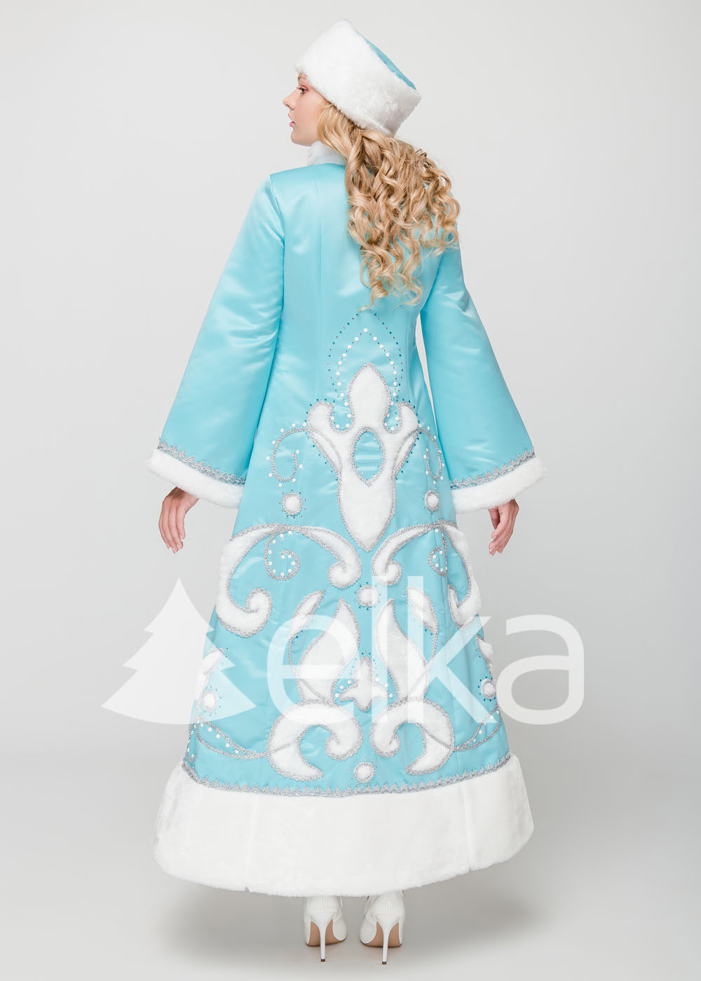 Шикарный костюм Снегурочки «Пандора» из королевского атласа нежно – голубого цвета расшит гламурными новогодними орнаментами, стразами и камнями. Идеальную расклешенную к низу форму помогает держать стеганая подкладка, которая не дает материалу мяться. Карнавальный наряд пошит с использованием инновационных технологий. Все детали и декор надежно закреплены, костюм не повредится во время активных игр под елкой. Дышащая структура материала позволяет поддерживать оптимальную для кожи температуру. Костюм подходит для улицы и помещений.