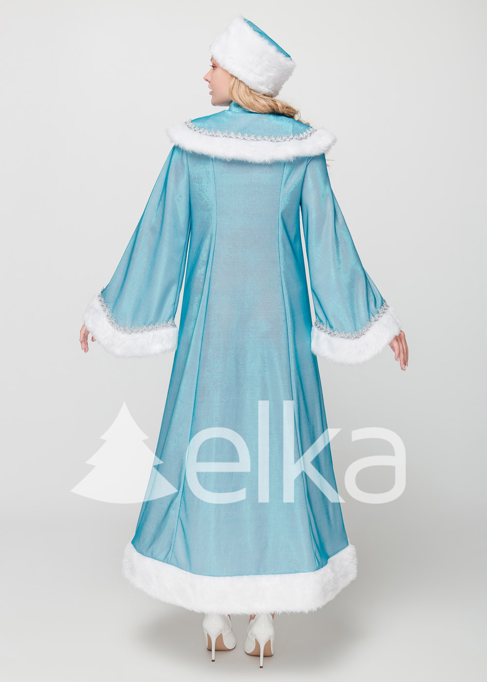 Стильный костюм Снегурочки «Селена» пошит из трикотажа. Ткань с богатым новогодним орнаментом завораживает своей красотой и изяществом. Боярская шапочка прекрасно держится на парике и натуральных волосах, не спадает во время активных движений. Отделка из белого меха не теряет цвет и блеск после нескольких сезонов использования. Костюм подходит для профессиональных выступлений в театре, кино. Костюм одевается через голову, под низ можно одеть креналин (подьюбник), который будет держать форму костюма. Сверху одевается круглая накидка.