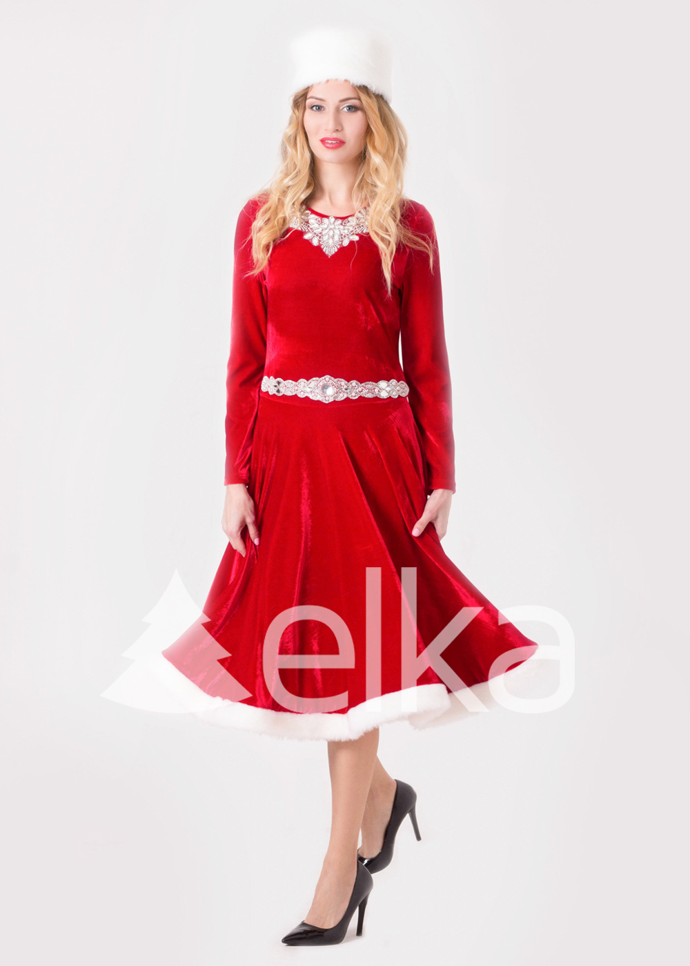 Новогоднее платье Снегурочки «Суздальская» пошито из натурального велюра. Материал красиво облегает силуэт. Расклешенная к низу юбка выглядит весело и игриво. Декольте платья и завышенный пояс украшены крупным новогодним орнаментом из страз паеток и стекляруса.
